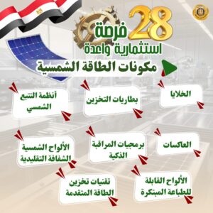 1- مكونات الطاقة الشمسية التي تشمل (الخلايا- بطاريات التخزين- أنظمة التتبع الشمسي- العاكسات- برمجيات المراقبة الذكية- الألواح الشمسية الشفافة التقليدية- الألواح القابلة للطباعة المبتكرة- تقنيات تخزين الطاقة المتقدمة)