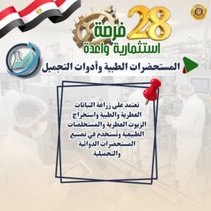 11- المستحضرات الطبية وأدوات التجميل: تعتمد على زراعة النباتات العطرية والطبية واستخراج الزيوت العطرية والمستخلصات الطبيعية وتُستخدم في تصنيع المستحضرات الدوائية والتجميلية