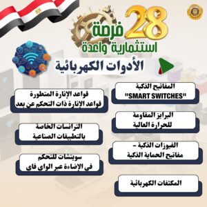 17- الأدوات الكهربائية (المفاتيح الذكية "Smart Switches"- قواعد الإنارة المتطورة مثل قواعد الإنارة ذات التحكم عن بعد- البرايز المقاومة للحرارة العالية- الترانسات الخاصة بالتطبيقات الصناعية- الفيوزات الذكية- سويتشات للتحكم في الإضاءة عبر الواي فاي- مفاتيح الحماية الذكية- المكثفات الكهربائية)