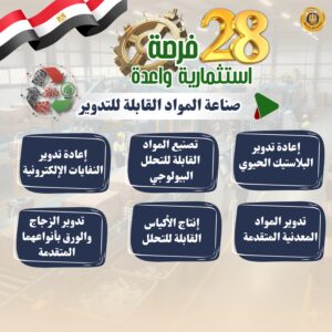 18- صناعة المواد القابلة للتدوير (إعادة تدوير البلاستيك الحيوي- تصنيع المواد القابلة للتحلل البيولوجي - إعادة تدوير النفايات الإلكترونية- تدوير المواد المعدنية المتقدمة- إنتاج الأكياس القابلة للتحلل- تدوير الزجاج والورق بأنواعهما المتقدمة)