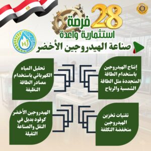 23- صناعة الهيدروجين الأخضر (إنتاج الهيدروجين باستخدام الطاقة المتجددة مثل الطاقة الشمسية والرياح- تحليل المياه الكهربائي باستخدام مصادر الطاقة النظيفة- تقنيات تخزين الهيدروجين منخفضة التكلفة - الهيدروجين الأخضر كوقود بديل في النقل والصناعة الثقيلة)