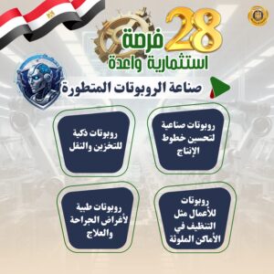 22- صناعة الروبوتات المتطورة (روبوتات صناعية لتحسين خطوط الإنتاج- روبوتات طبية لأغراض الجراحة والعلاج- روبوتات ذكية للتخزين والنقل - روبوتات للأعمال مثل التنظيف في الأماكن الملوثة)